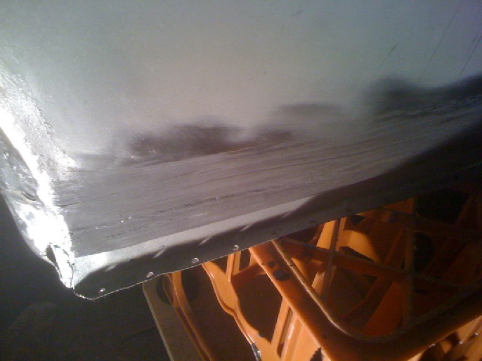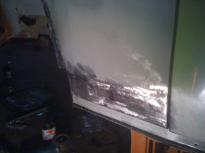 Hier verzinne ich gerade die Schweissnaht am Seitenteil unten, an der Beifahrerseite. Dort wurden von der Aussenhaut etwa 3cm unten abgetrennt wegen Rost.