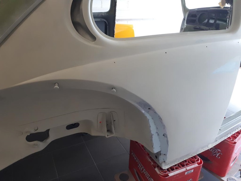 So... und weiter gehts mit der Angleichung des Radlaufbogens hinten rechts, bzw. des rechten Seitenteils unterhalb. Hier waren mehrere Versuche notwendig, bis mir die Form zusagte. Es wurde immerwieder nach dem Trocknen der Polyesterspachtelmasse geschliffen und mit der flachen Hand über die Fläche gefühlt, ob noch leichte Wellen oder Vertiefungen im Blech sind.