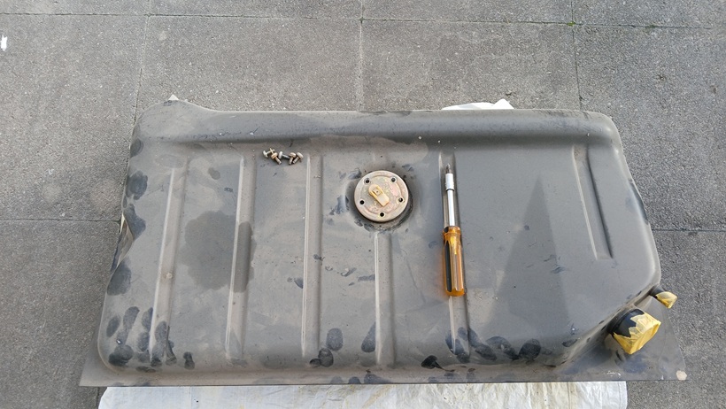 Der Tank wird in den nächsten Tagen komplett abgeschliffen. Dazu wird der Tankgeber ausgebaut. Alle Öffnungen werden dann mit Klebeband zugeklebt, damit beim Bearbeiten (Entrosten) nichts in den Tank hineinfällt.