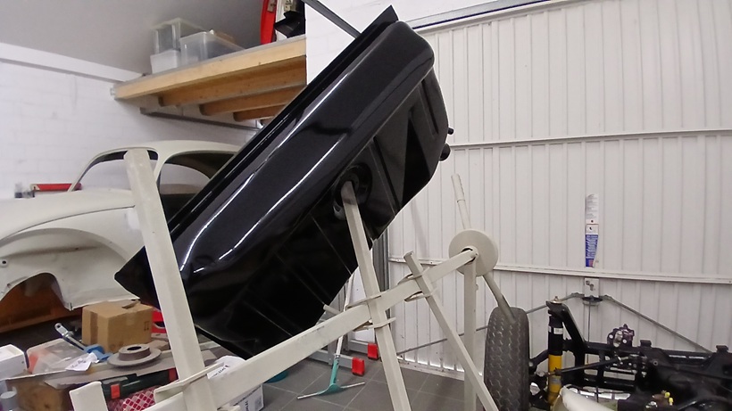 Danach wurde alles abgereinigt mit Silikonentferner und der Tank schwarz seidenmatt lackiert. Zunächst sieht die Farbe hochglänzend aus. Aber nach dem Trocknungsvorgang sieht der Tank dann sozusagen aus wie ab Werk (wie KTL-Beschichtung) und die leichte Mattierung kommt dann erst zum Vorschein. Es handelt sich um einen hochwertigen Sprühlack aus der Spraydose mit integrierter Härterpatrone. Diese muss vor dem Lackieren aktiviert werden und dann wird die Spraydose kräftig geschüttelt. Dieser 2-Komponentenlack hat wie immer den Vorteil, das er wischfest, ölbeständig und kraftstoffbeständig ist, im Gegensatz zu billigen 1-Komponenten-Produkten, die nur mit der Luft trocknen. Deshalb habe ich bisher am Käfer auch nur 2-Komponenten-Produkte verwendet.