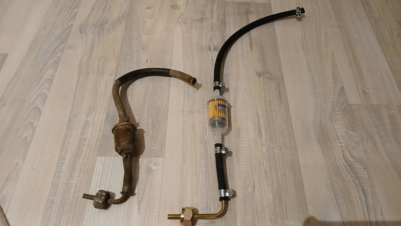 Links im Bild die Neuteile. Hier fehlt nur noch der Benzinschlauch in 10mm Aussendurchmesser und 6mm Innendurchmesser. Dieser ist auf dem Postweg. Selbstverständlich werden auch ein neuer Benzinfilter und neue Schlauchschellen verwendet.