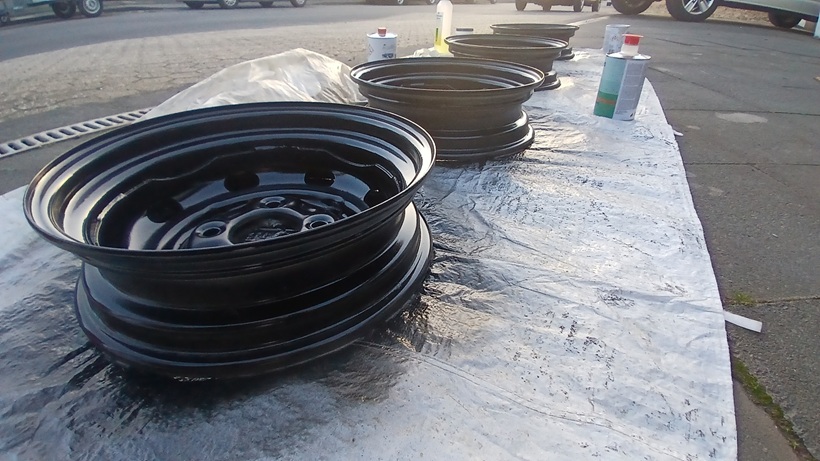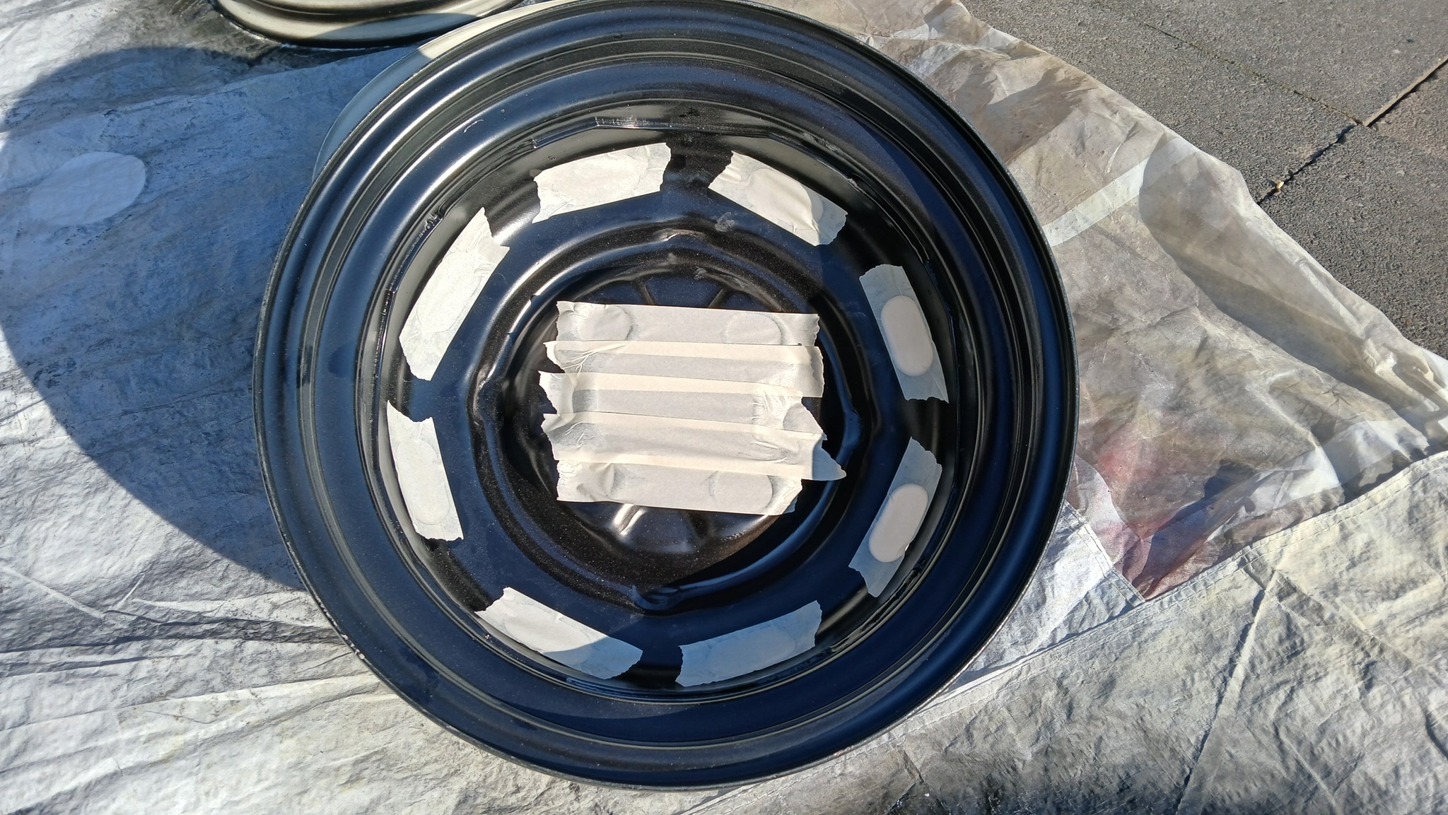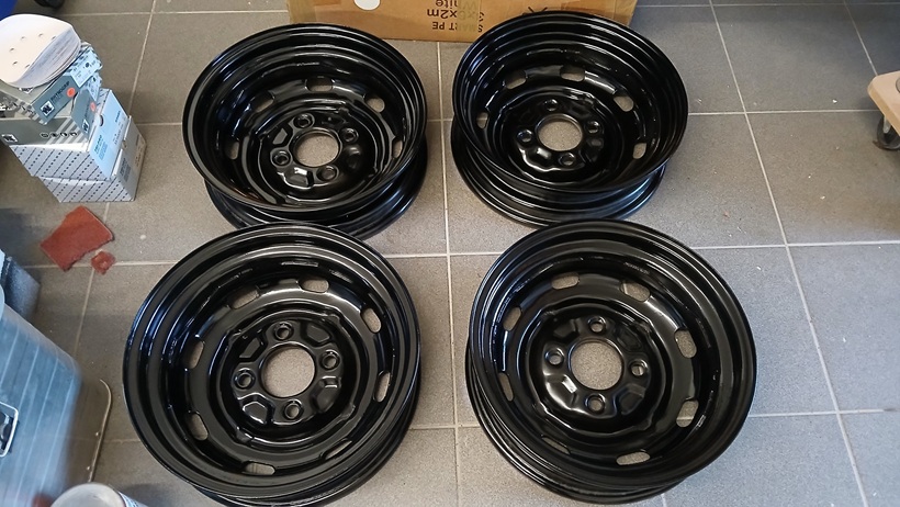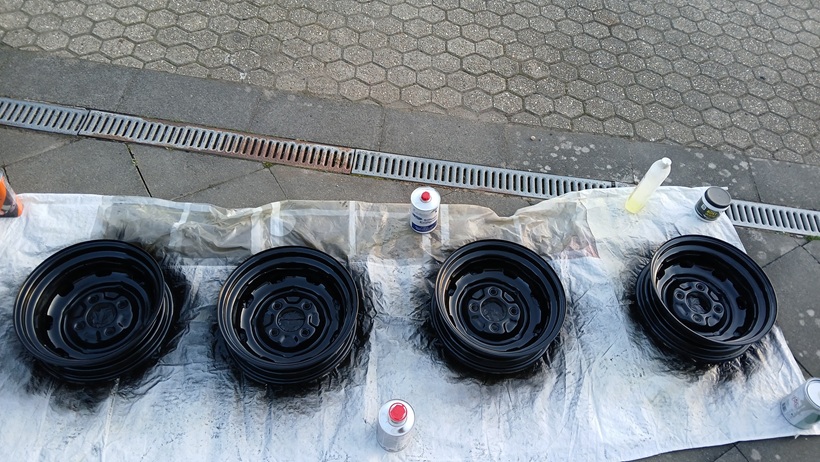 Alle 4 Felgenschüsseln wurden danach mit schwarz-seidenmatt lackiert (2-Komponenten-Lack). Noch ist es schwarz hochglanz. Nach dem Trockenvorgang wird es seidenmatt.