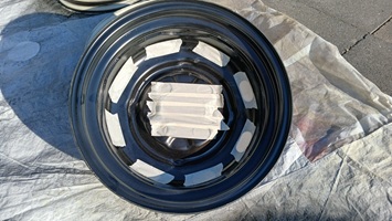 Am 19.03.26 wurden die Frontseiten der Felgen mit P600 angeschliffen und mit Silikonentferner abgereinigt. Danach werden die Felgenlöcher von innen mit Klebeband zugeklebt, damit kein silberner Lack-Sprühnebel in die schwarz-seidenmatte Felgenschüssel vordringen kann. Wichtig ist auch, das man in der Rille zwischen Felgenschüssel und Aussenumrandung (sichtseitig) einmal mit einem scharfen Cutter-Messer durch die Rille geht, wo die Felgenteile zusammengeschweisst sind. Danach nochmals mit Pressluft die Felge abpusten. Schleifstaub oder Strahlgut kann sich in der Rille nämlich verewigen und wird dann mitlackiert... Sieht dann unschön aus...