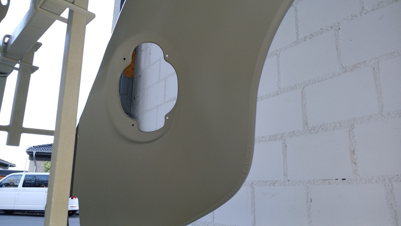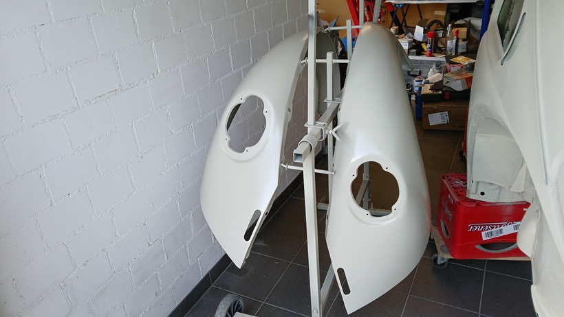 Am 06.11.25 wurde die Vorgrundierung der hinteren beiden Kotflügel angeschliffen. Ein Kotflügel musste über der Rückleuchtenaufnahme etwas mit Spachtel angeglichen werden (kleine Delle von der Lagerung).