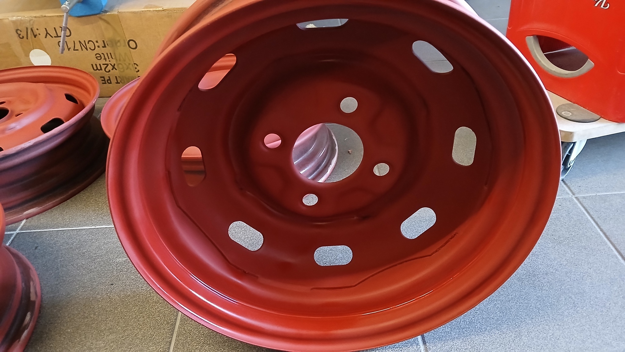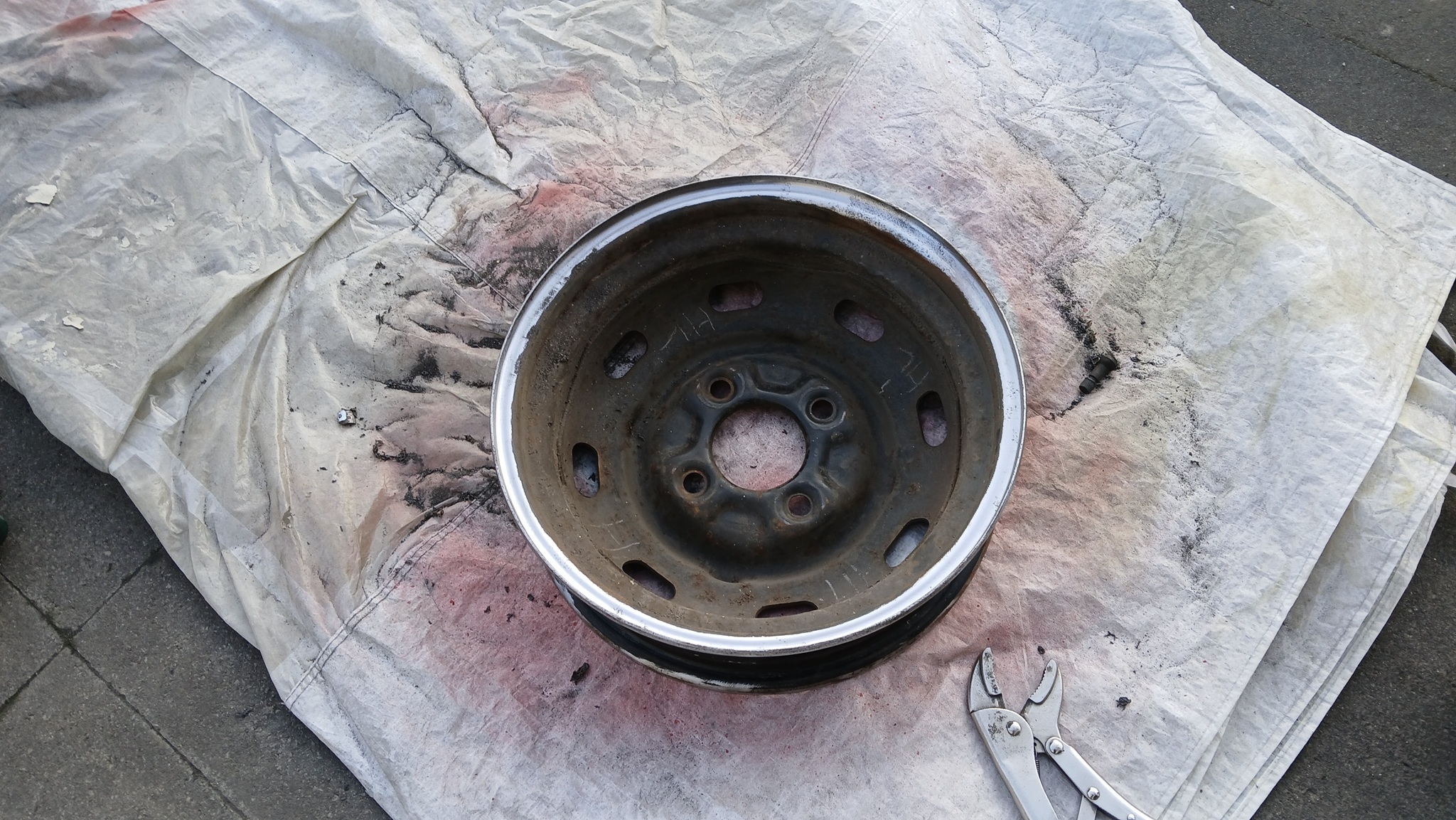 Allerdings sehen die neu erworbenen Felgen besser aus, als die 28x überstrichenen Stahlfelgen (4,5J x15), die zur Zeit noch am Fahrgestell montiert sind.