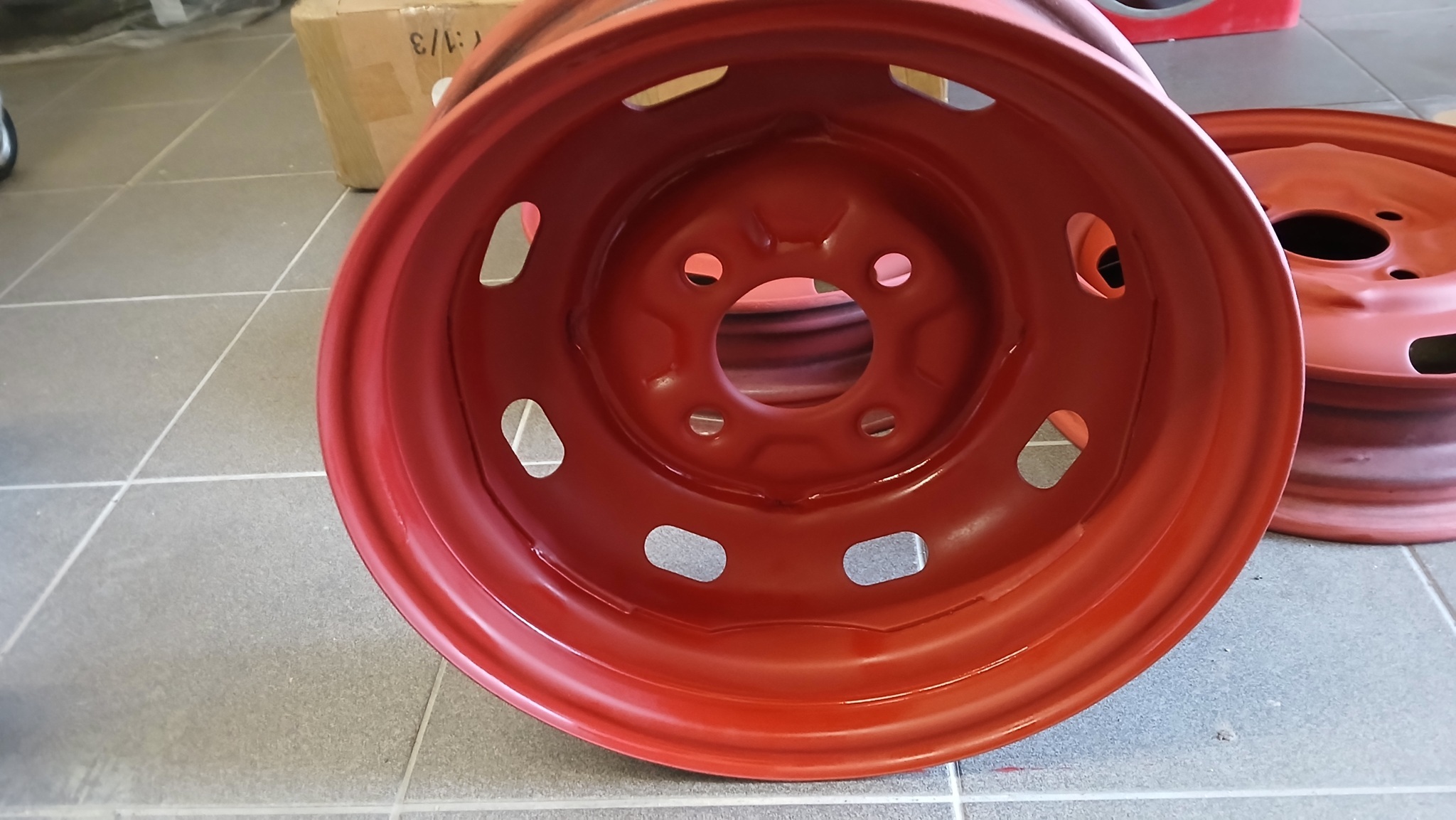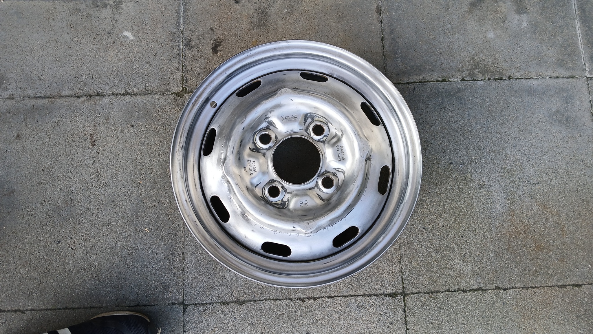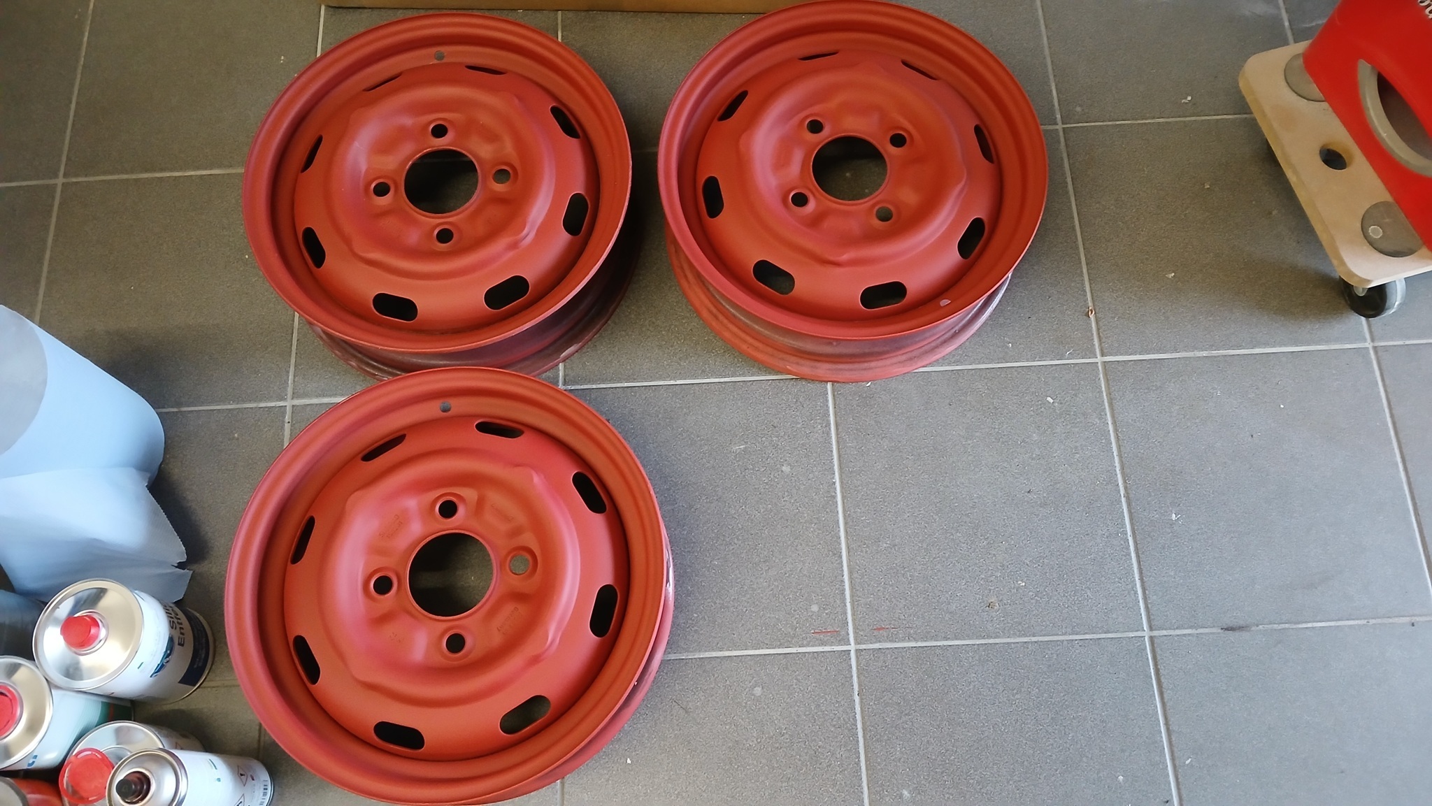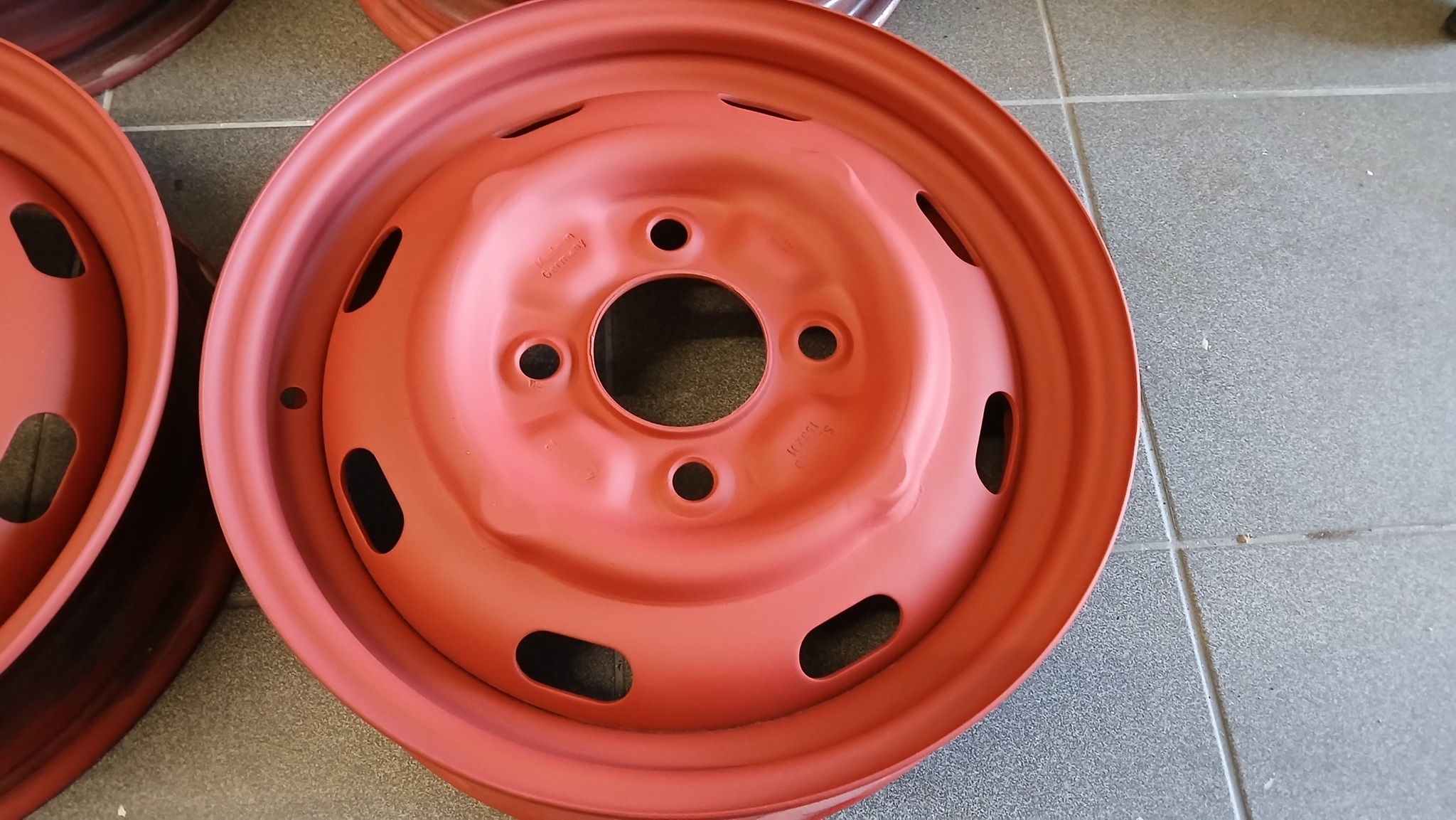 Damit ich nicht untätig im Winter herumsitze, habe ich mir ein paar günstige "neue" gebrauchte Käferfelgen ohne Reifen organisiert. Die Grösse ist 4J x 15. (so wie es gehört lt. Prospekt, für den 1200L Käfer von 1979).
