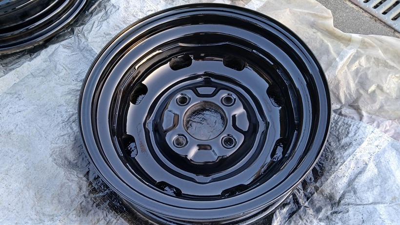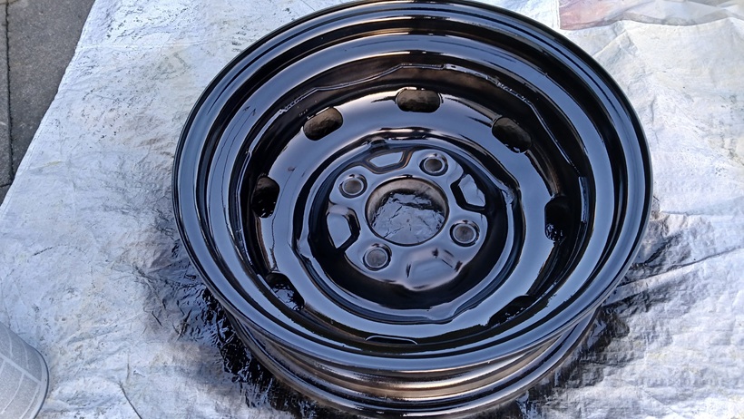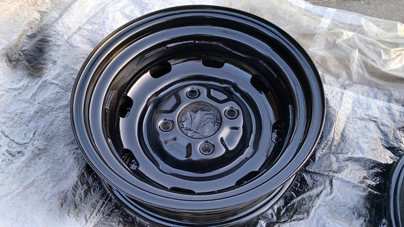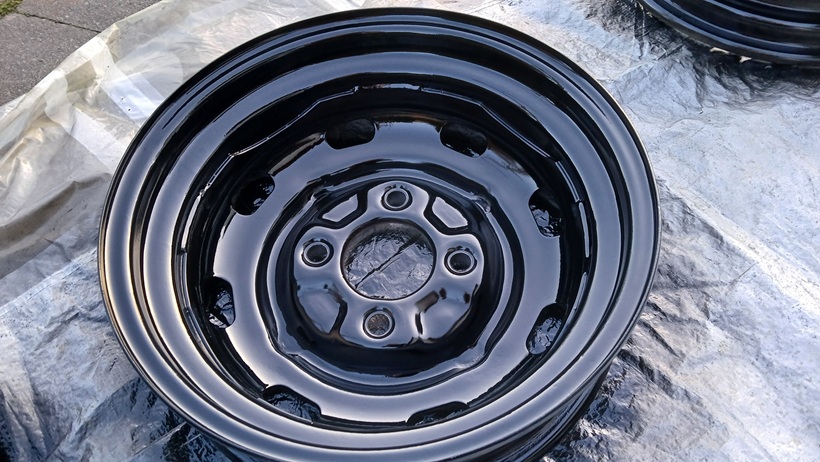 Alle 4 Felgenschüsseln wurden danach mit schwarz-seidenmatt lackiert (2-Komponenten-Lack). Noch ist es schwarz hochglanz. Nach dem Trockenvorgang wird es seidenmatt.