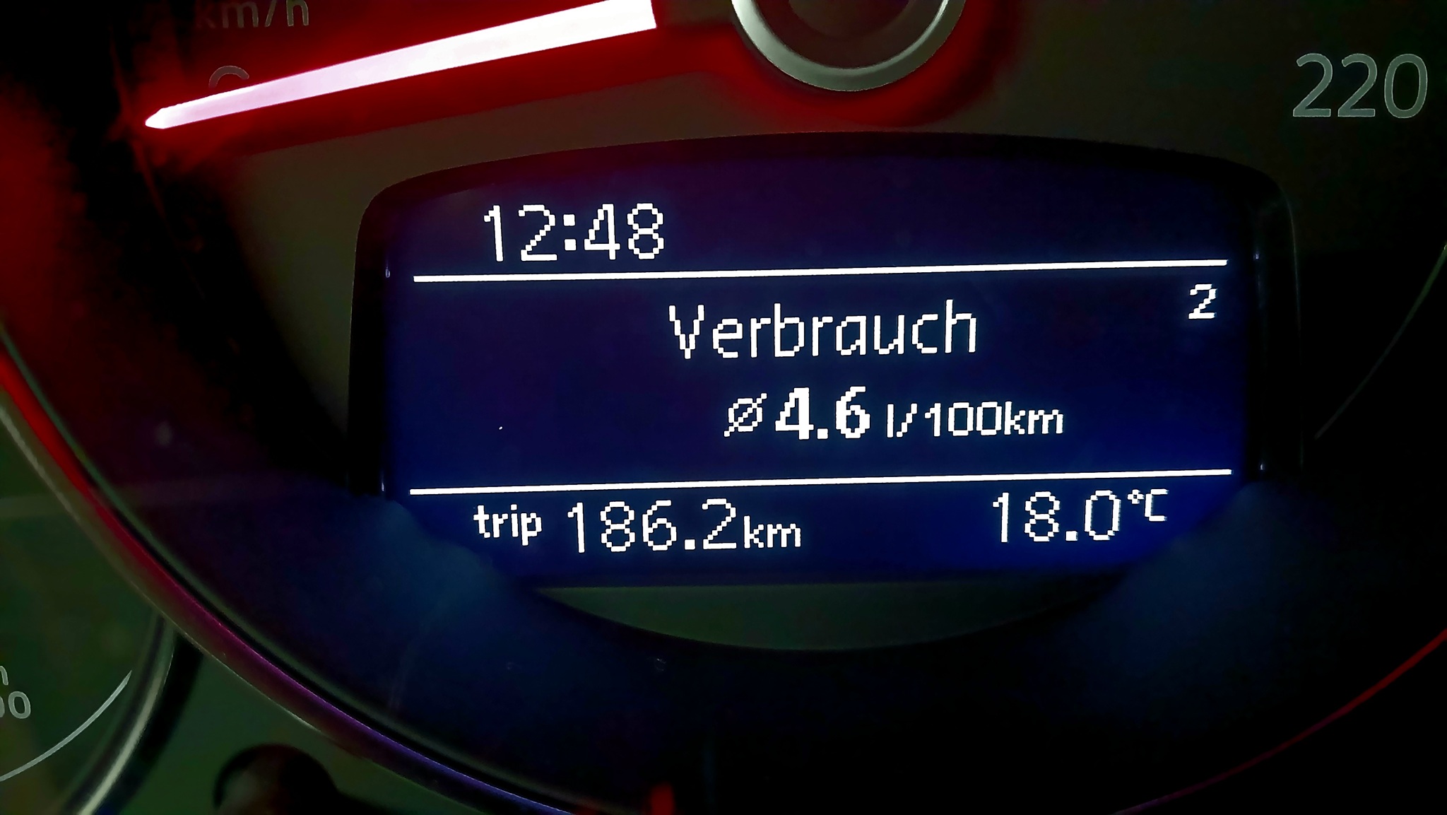 4.6 bis 4.9 Litern pro 100km, im Langzeitspeicher, bei normaler und ruhiger Fahrweise.