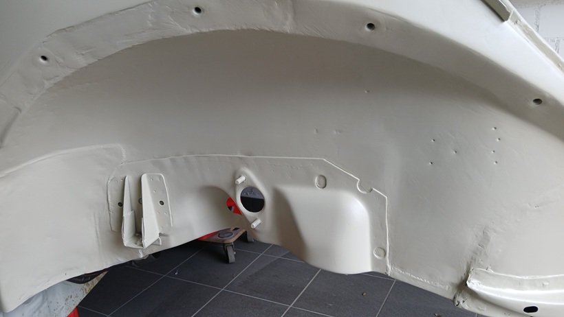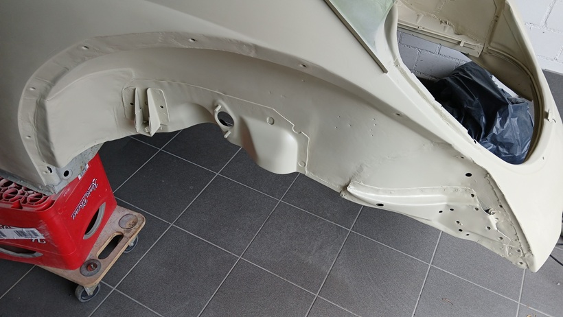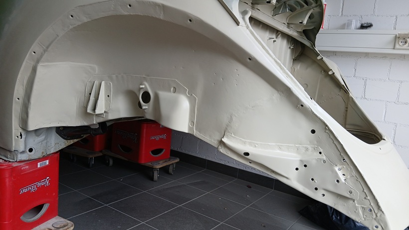 Anfang August 2025 wurde die Vorgrundierung im hinteren linken Radhaus aufgebracht. Man sieht hier den halben instand gesetzten Radlaufbogen mit seinen Anschraubgewinden im hellen Grundierton besonders gut.