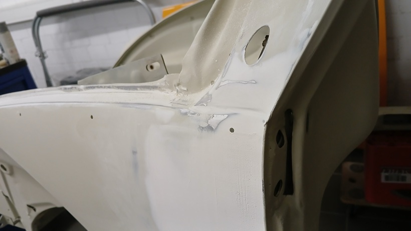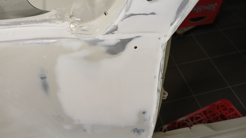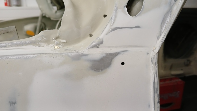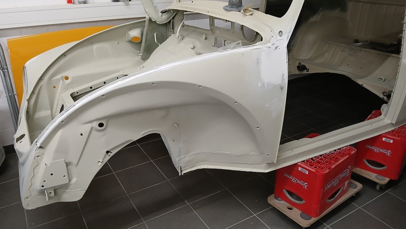 Am 19.09.25 wurden am Vorderwagen links noch zwei kleine Dellen beseitigt, die sich unter der hellen Vorgrundierung bemerkbar machten.