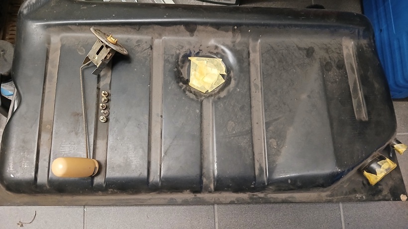 Der Tank wird in den nächsten Tagen komplett abgeschliffen. Dazu wird der Tankgeber ausgebaut. Alle Öffnungen werden dann mit Klebeband zugeklebt, damit beim Bearbeiten (Entrosten) nichts in den Tank hineinfällt.