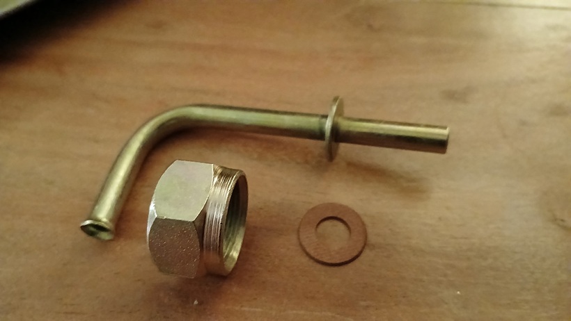 Mittlerweile ist auch schon das Kraftstoffablaufrohr in gelbverzinkt mit Überwurfmutter und neuer Dichtung per Post eingetroffen. Das alte Rohr sieht einfach unschön aus und auch die Verzinkung ist nicht mehr vorhanden + alte Dichtung ist spröde.