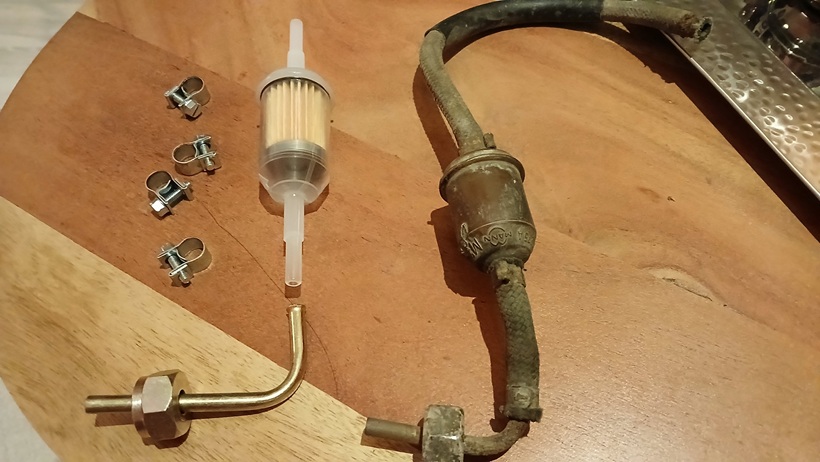 Links im Bild die Neuteile. Hier fehlt nur noch der Benzinschlauch in 10mm Aussendurchmesser und 6mm Innendurchmesser. Dieser ist auf dem Postweg. Selbstverständlich werden auch ein neuer Benzinfilter und neue Schlauchschellen verwendet.