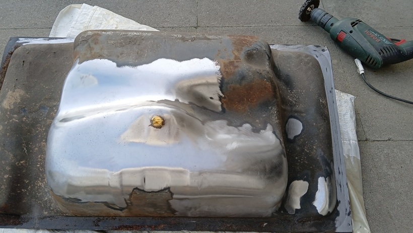 Die untere Hälfte des Tanks wird mit der Bohrmaschine und einem CSD-Schleifaufsatz entrostet. Das geht bisher recht gut und man kann eigentlich nur von leichtem Rostansatz sprechen, obwohl es schlimm aussah.
