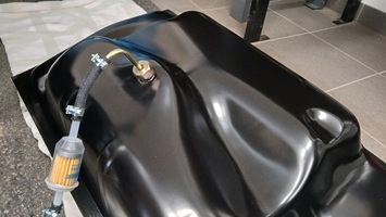 Der Tank wird komplett von aussen entrostet, dann grundiert und lackiert in schwarz seidenmatt (2Komponentenlack).