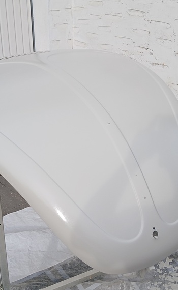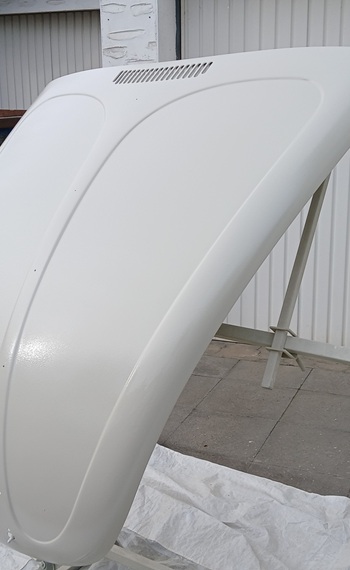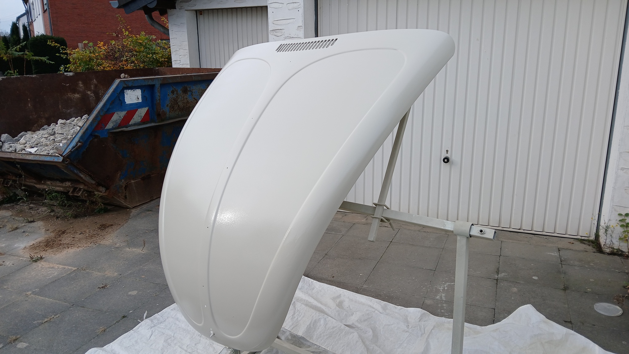 Am 06.11.25 wurde die Vorgrundierung der hinteren beiden Kotflügel angeschliffen. Ein Kotflügel musste über der Rückleuchtenaufnahme etwas mit Spachtel angeglichen werden (kleine Delle von der Lagerung).