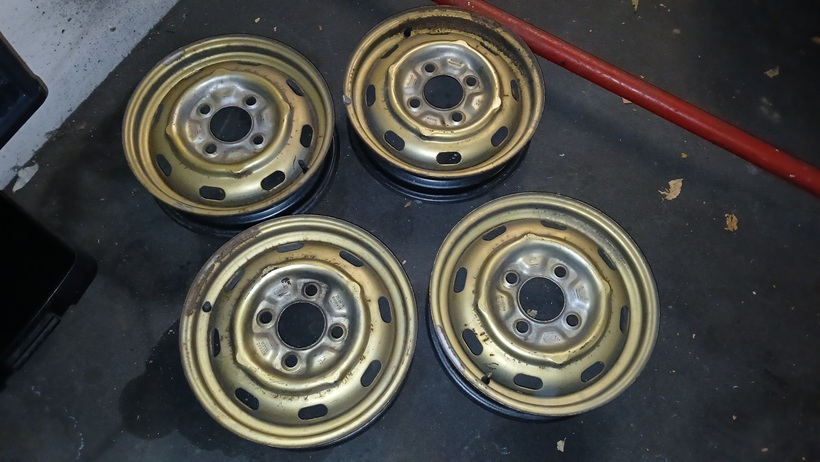 Die Felgen stammen alle von einem Fahrzeug. Es muss wohl ein Sondermodell " VW Käfer Special Bug" gewesen sein. Denn nur diesen gab es werksseitig mit goldlackierten Felgen.