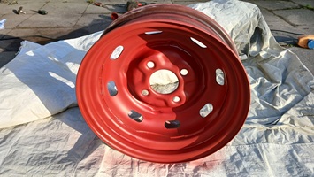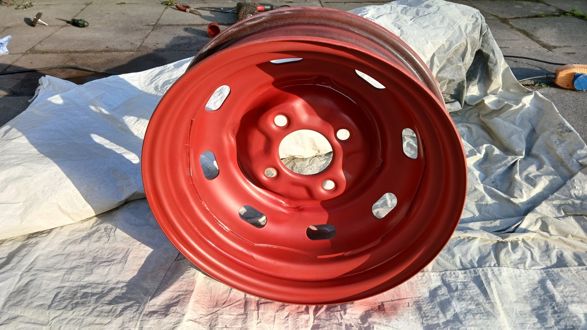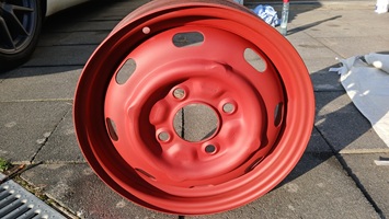 Ich reinigte die Felge mit einem Papiertuch und Silikonentferner. Danach wurde ein mattroter Einkomponenten-Rostschutzlack auf den blanken Stahl aufgetragen, damit nicht gleich wieder der Rost ansetzt aufgrund von Luftfeuchtigkeit u. a.
