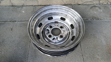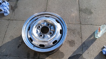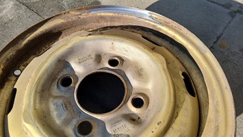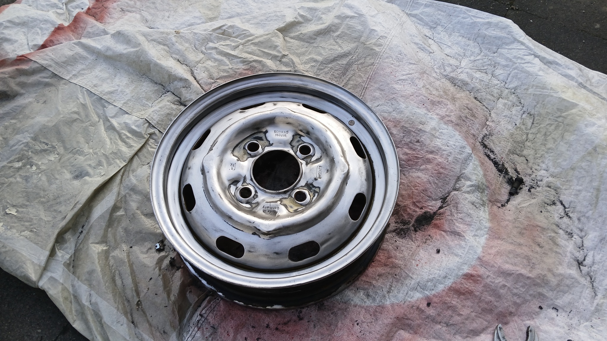 Allerdings sehen die neu erworbenen Felgen besser aus, als die 28x überstrichenen Stahlfelgen (4,5J x15), die zur Zeit noch am Fahrgestell montiert sind.
