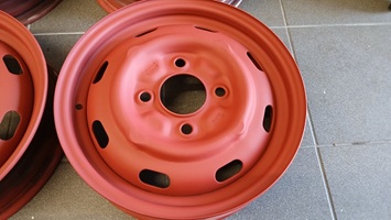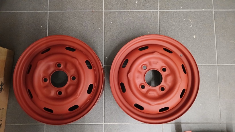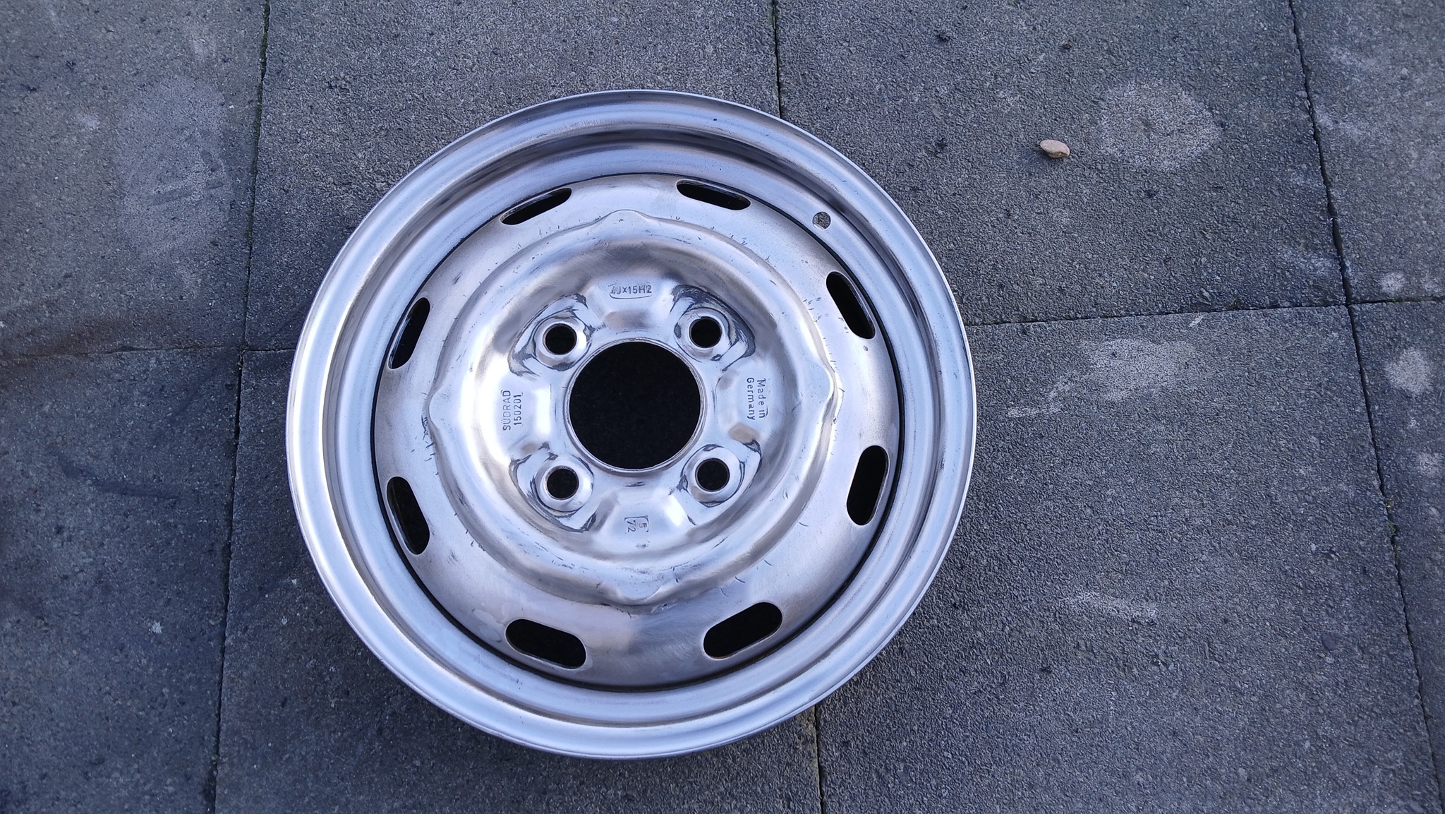 Damit ich nicht untätig im Winter herumsitze, habe ich mir ein paar günstige "neue" gebrauchte Käferfelgen ohne Reifen organisiert. Die Grösse ist 4J x 15. (so wie es gehört lt. Prospekt, für den 1200L Käfer von 1979).
