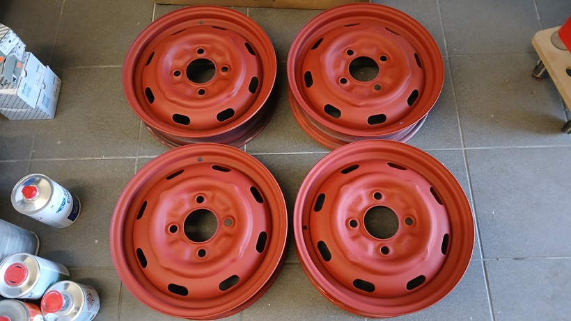 In den nächsten Tagen, werden alle 4 Felgen mit Schleifvlies leicht angeschliffen. Dann erfolgt, für alle Felgen in einem Durchgang, die besagte 2-Komponenten-Epoxygrundierung.