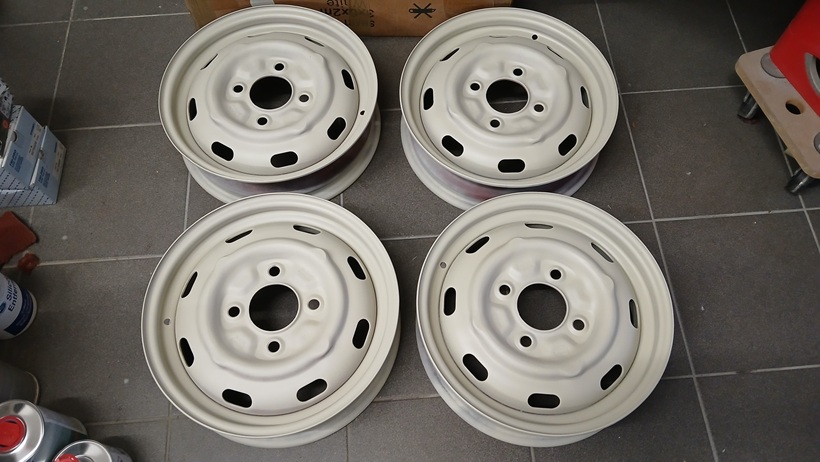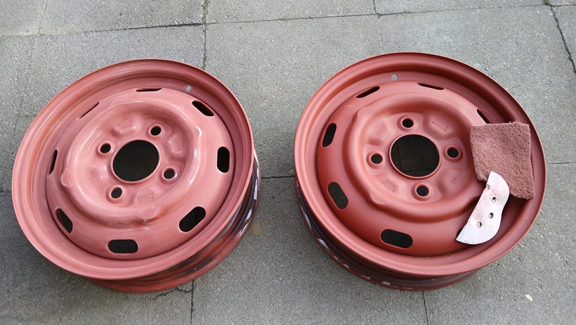Morgen gehts weiter und dann wird die Epoxy-Grundierung mit P600 in den Felgenschüsseln angeschliffen. Dann werden nur die Felgenschüsseln in schwarz-seidenmatt lackiert (2K-Farbe). Denn ab Werk waren die Felgen immer komplett schwarz seidenmatt beschichtet und bekamen dann lediglich frontal die silberne Farbe ab.