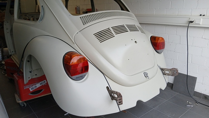 Der linke hintere Kotflügel fluchtete am unteren Rand zunächst nicht mit dem Heckabschlussblech, so das hier ein kleiner Versatz von etwa 4 mm war. Ich musste ein paar Befestigungslöcher des linken Kotflügels leicht verlängern, damit der Kotflügel weiter nach oben kam und es am unteren Karosserieende eine saubere Abschlusslinie ergibt.