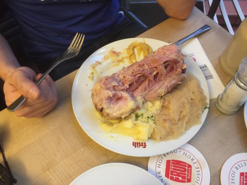 Hier sind wir im "Frueh" in Köln. Es gibt Kölsch und Schweinshaxe.